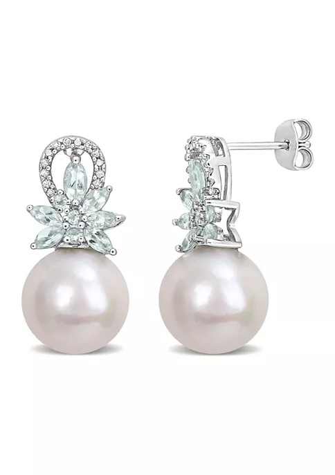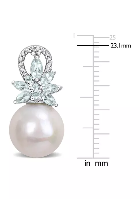 - Post back, Butterfly clasp, 2 pearl, 14 aquamarine, 20 diamond