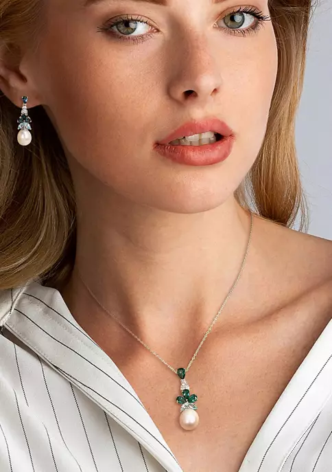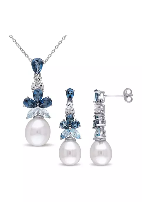 - Post back, Spring ring clasp, 3 pearl, 9 white topaz, 6 sky blue topaz, 12 london blue topaz