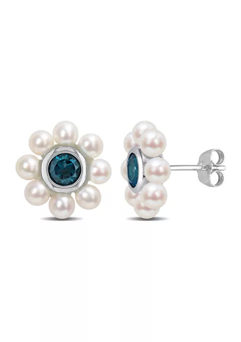 - Post back, Butterfly clasp, 16 pearl, 2 london blue topaz