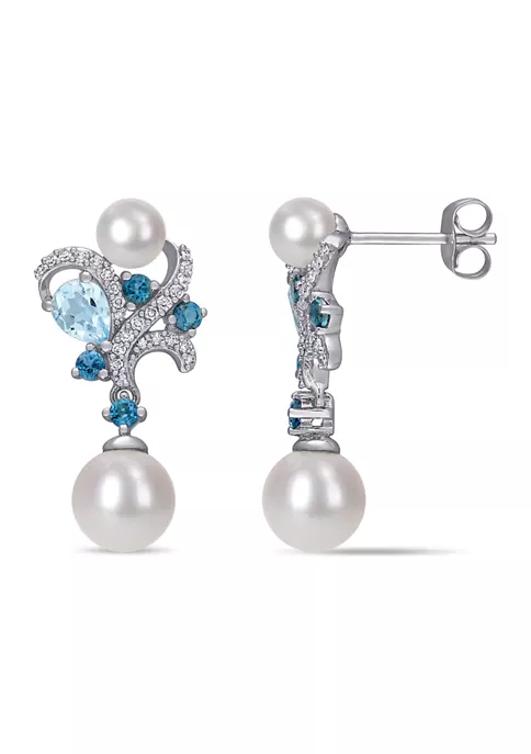 - Post back, Butterfly clasp, 4 pearl, 2 sky blue topaz, 8 london blue topaz, 50 diamond