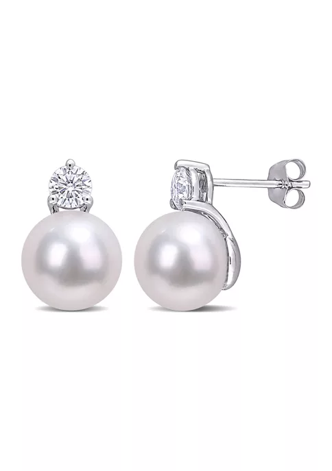 - Post back, Butterfly clasp, 2 pearl, 2 created white moissanite