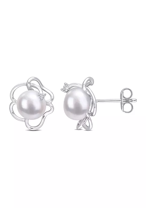 - Post back, Butterfly clasp, 2 pearl, 2 created white sapphire