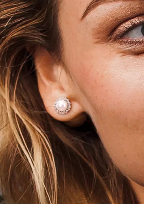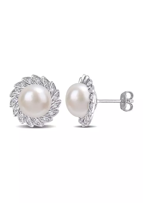 - Post back, Butterfly clasp, 2 pearl, 30 created white sapphire